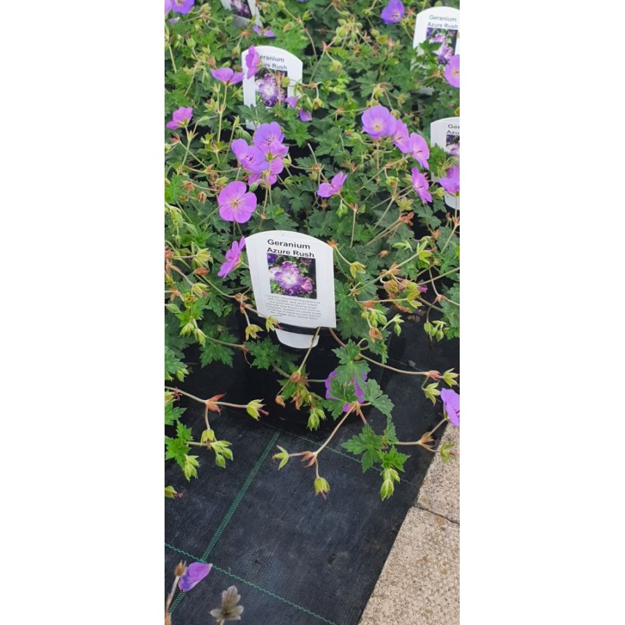 'Azure Rush' is a compact perennial that looks like its well-known parent, 'Rozanne. It has a long flowering period from early summer to autumn with light, lavender-blue flowers.