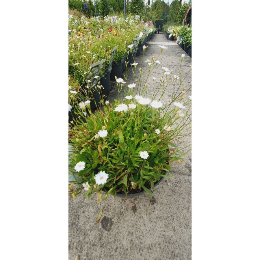 The 'Starry Dreams' variety of the Silene alpestris plants showcases dense, verdant leaves and an abundance of snowy-white blooms that emerge in the early summer.