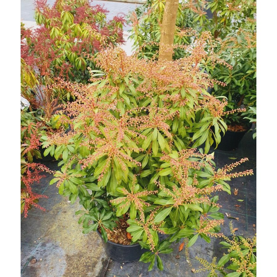 a bushy medium-sized evergreen shrub with young red leaves, turning